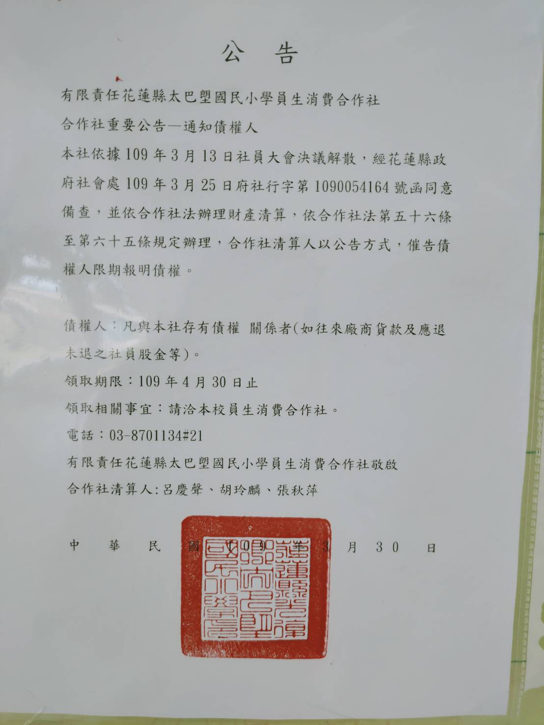 一、本社依據109年3月13日社員大會決議解散,經花蓮縣政府社會處109年3月25日府社行字第1090054164號函同意備查,並依合作社法辦理財產清算,依合作社法第五十六條至第六十五條規定辦理,合作社清算人以公告方式,催告債權人限期報明債權。