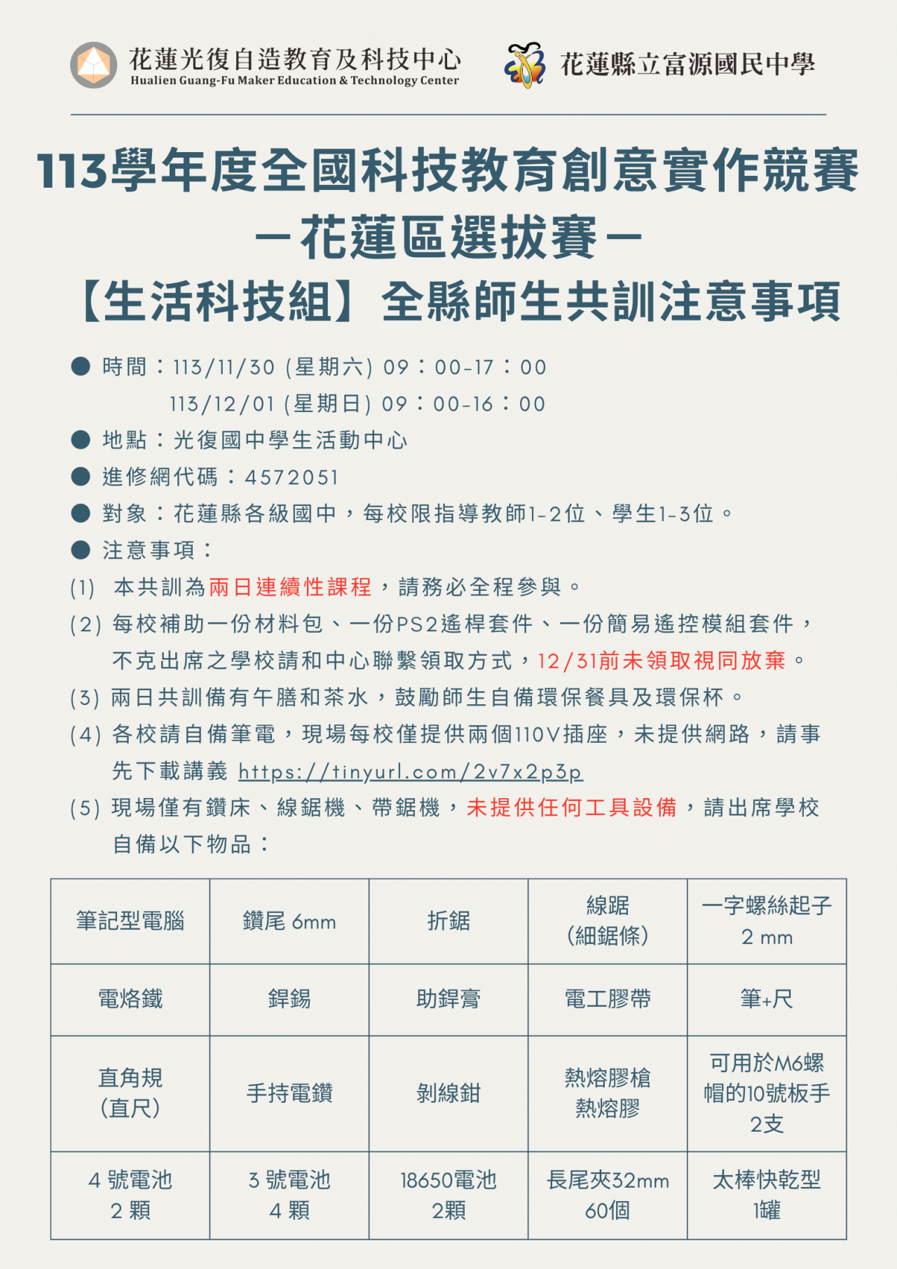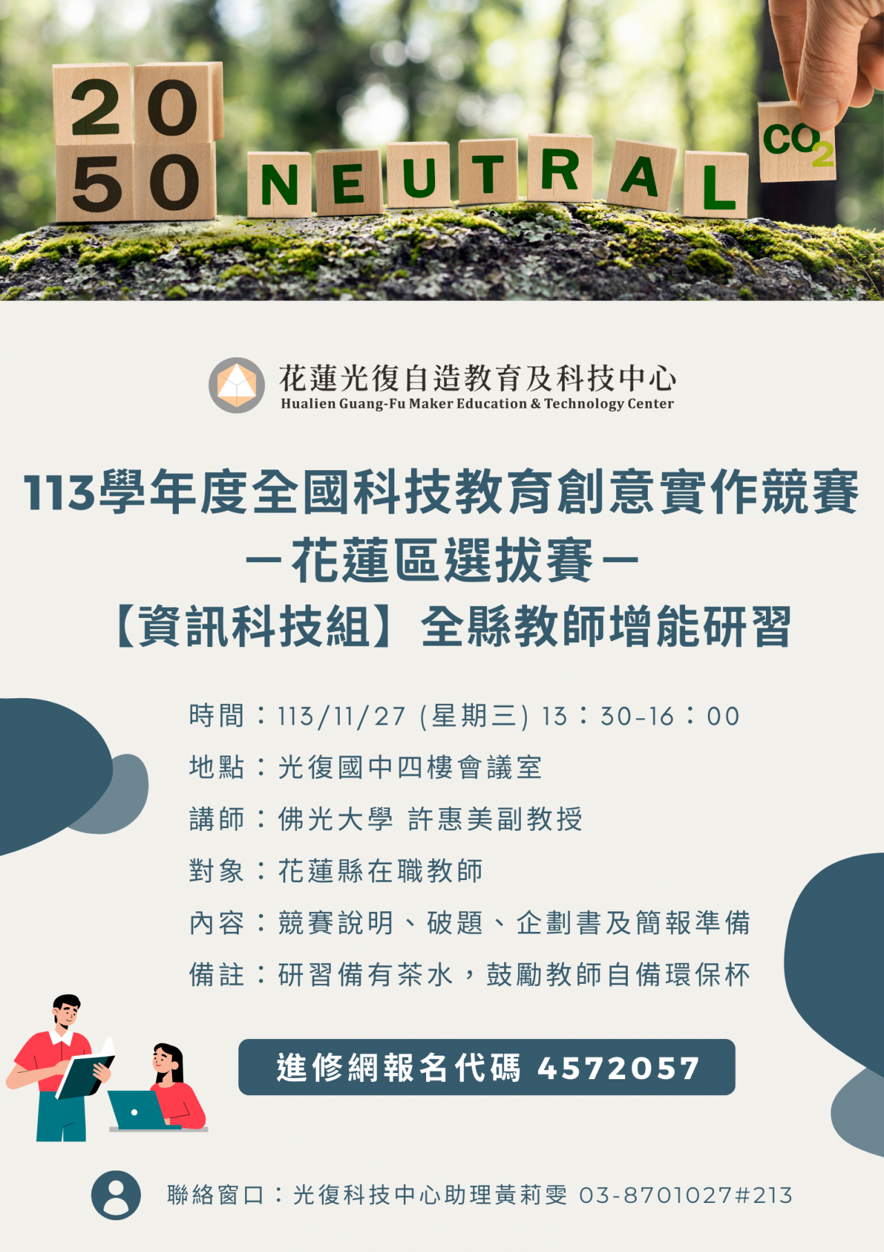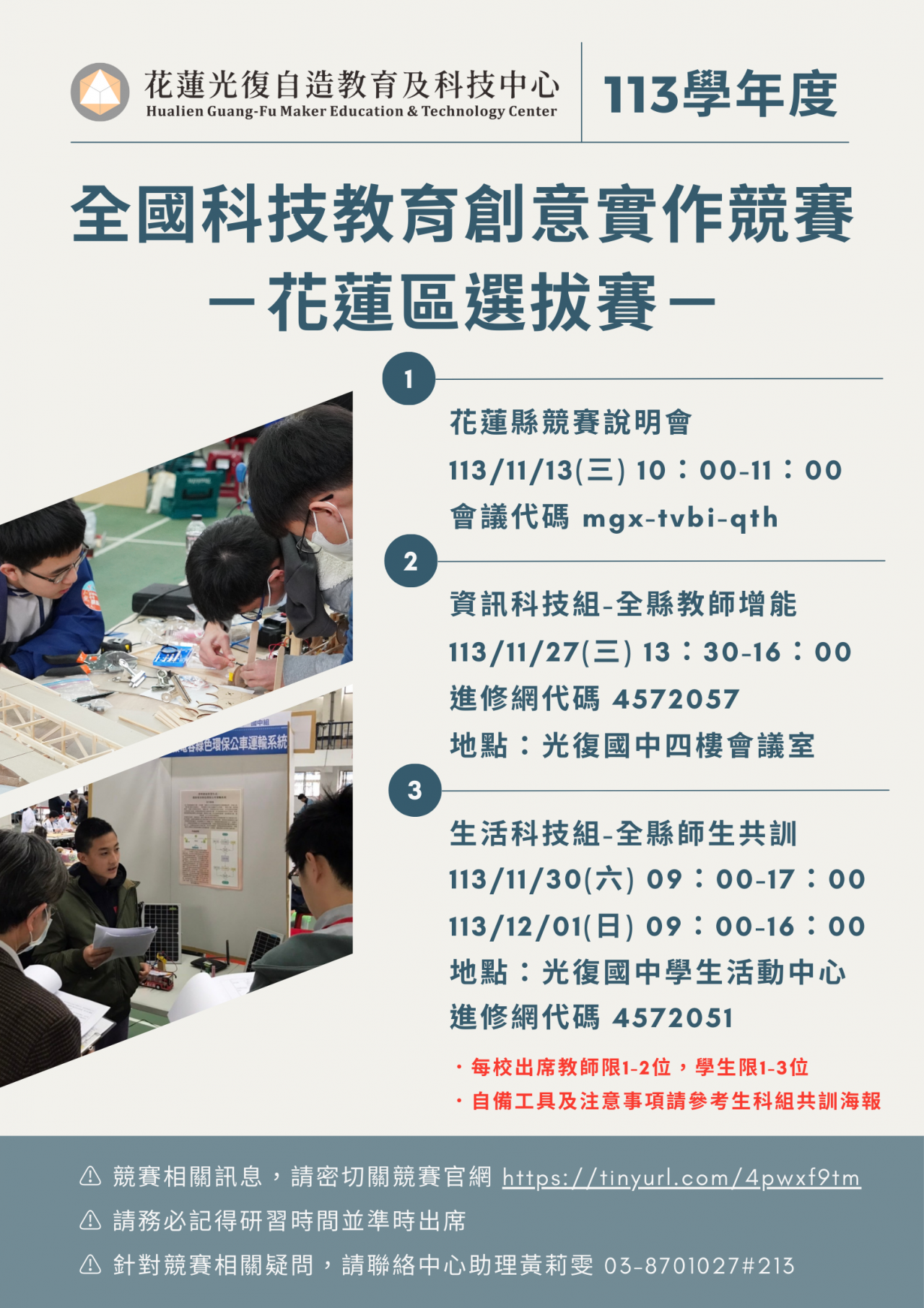 主旨: | 本縣辦理113學年度全國科技教育創意實作競賽_ 花蓮區選拔賽,相關事項如說明,請查照。 |