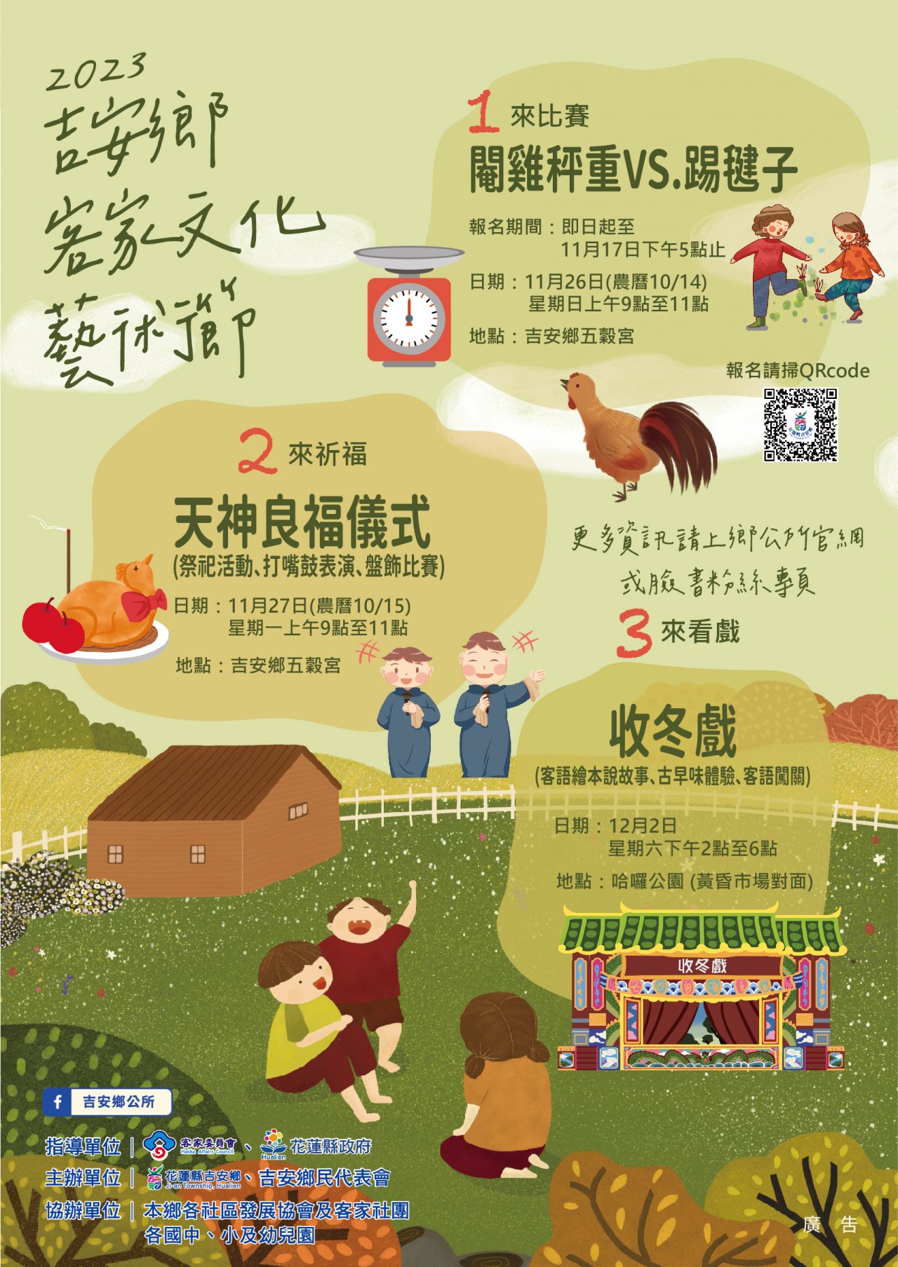 主旨: | 檢送本所於112年11月26日辦理「112 年客家文化藝術節系列活動 吉安天神良福祭 暨 共下 來 客庄看大戲」活動海報及踢毽子報名表乙份,請協助張貼海報廣為宣傳及歡迎報名參加,請查照。 |