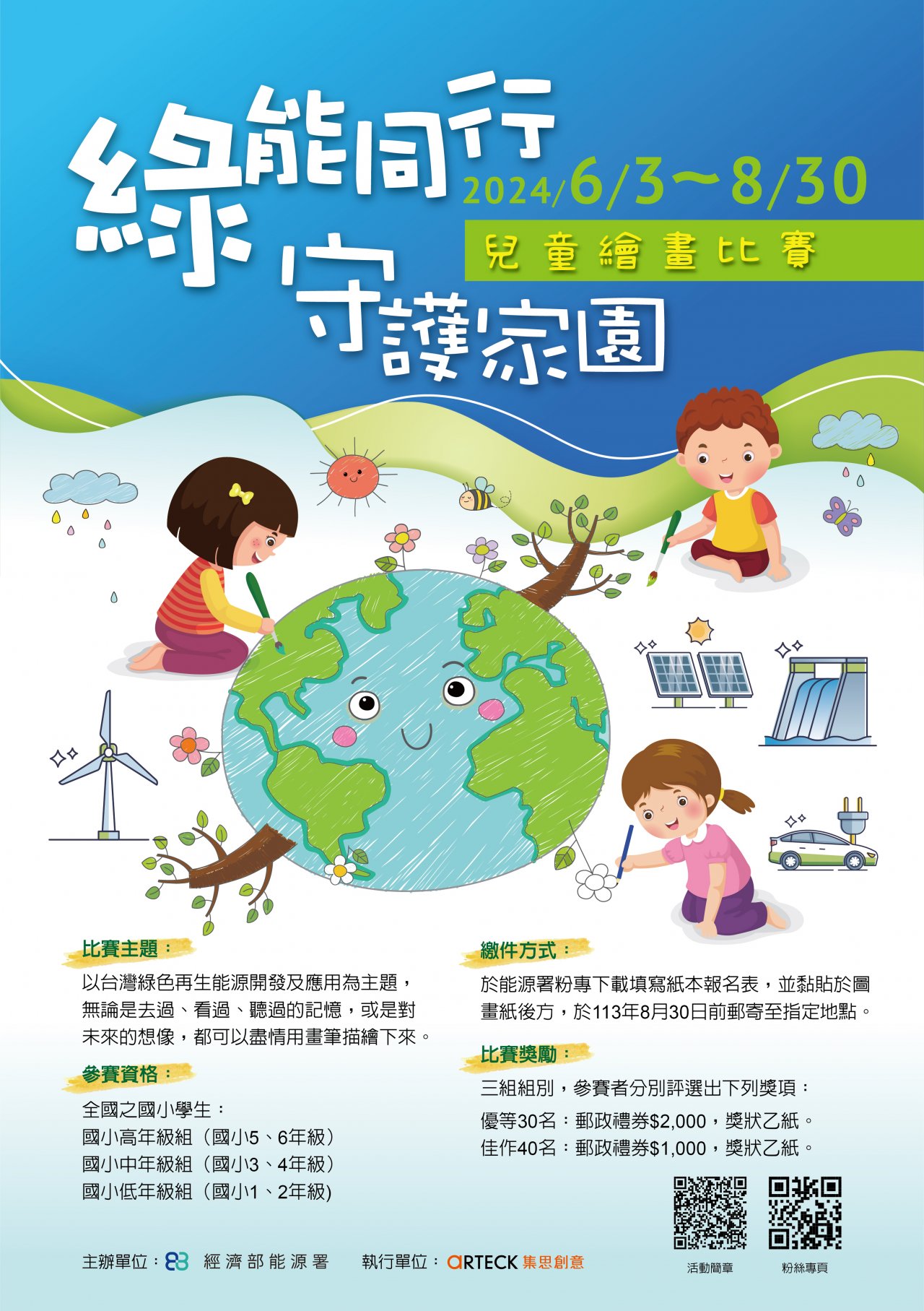 二、 綠能發展不僅提升我國能源自主性,及改善環境品質,為下一代奠定能源永續發展之基礎,經濟部能源署舉辦2024「綠能同行 守護家園」兒童繪畫比賽,鼓勵兒童以各式發展中之綠能為靈感,運用色彩及線條等彩繪方式,展現無限想像力及創造力。