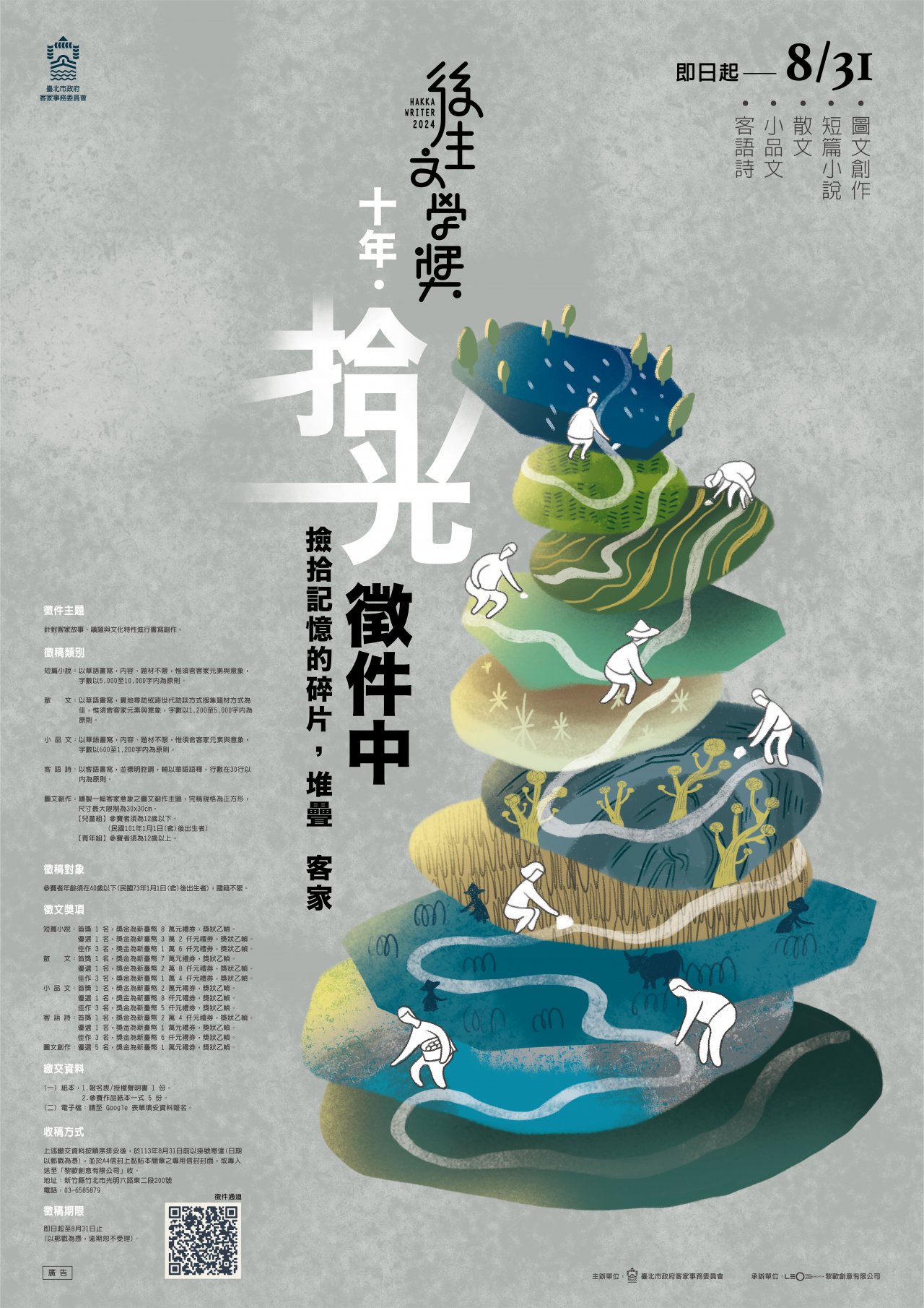 主旨: | 函轉臺北市政府客家事務委員會舉辦「2024後生文學獎」,徵選短篇小說、散文、小品文、客語詩及圖文創作,請貴校踴躍投稿,請查照。 |