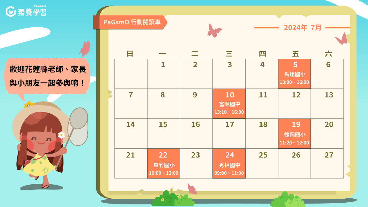 一、 為解決暑期學生數位學習滑波,花蓮PaGamO素養品學堂將於2024年7、8月暑假期間舉辦【行動閱讀車】活動,藉由數位閱讀與親師生互動,促進學生數位素養及閱讀習慣,活動將以實體及線上直播方式同步進行。
