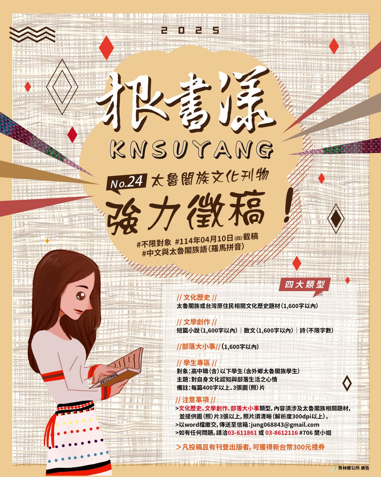 主旨: 檢送本所辦理114年度「太魯閣族文化刊物製作出版計畫」-第24期文案徵稿,惠請廣為宣傳周知,詳如說明,請查照。
