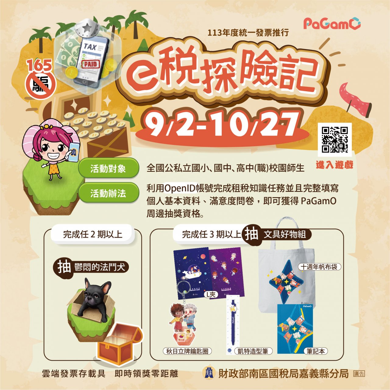 五、 活動辦法:校園師生在活動期間內利用Open ID登入PaGamO線上遊戲學習平台,再至任務書點選「世界任務」,選擇「e稅探險記」任務書,完成任一主題任務(有雲端發票、反詐騙、性別平等、廉能政策總計4檔期任務),任務完成可獲得任務限定「虛擬寶物-E稅載具」作為任務獎勵。