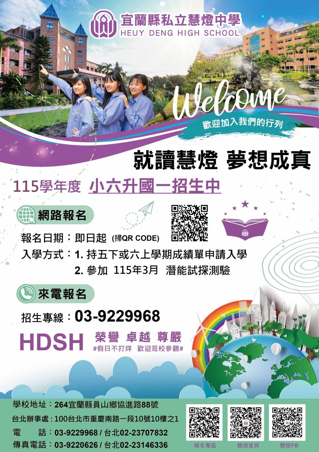 三、 檢附升學輔導說明會參加意願調查表,宜蘭縣、花蓮縣請郵寄或傳真至本校招生處林秀慧組長,地址:264宜蘭縣員山鄉協進路88號,連絡電話:(03)9229968、傳真電話:(03)9220626。臺北市、新北市、桃園市、基隆市,可逕洽本校台北辦事處,地址:100臺北市中正區重慶南路一段10號10樓之1。連絡電話:(02)23707832、傳真電話:(02)23146336。